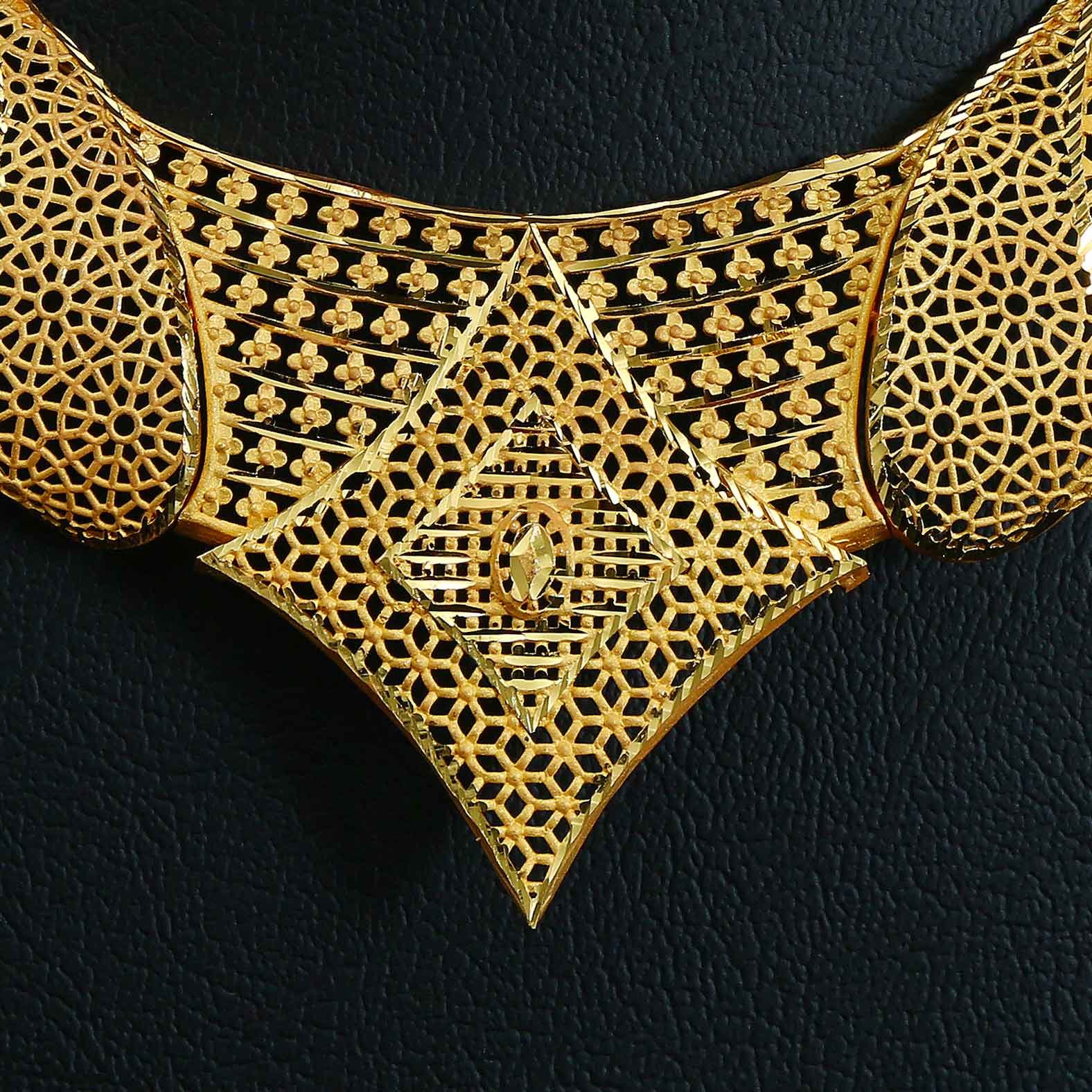 Seize our exclusive royal wedding set with polished designs to enrich your dignity for every occasion. This jewelry set is completely made up of quality brass and copper materials that do not harm your skin and helps to enhance your beauty. Get a complete exclusive range for weddings and parties with this elegant gold-plated necklace by pairing it with matching statement earrings and rings. Perfect for stylish women in the UAE, including Dubai, Abu Dhabi, and Sharjah.