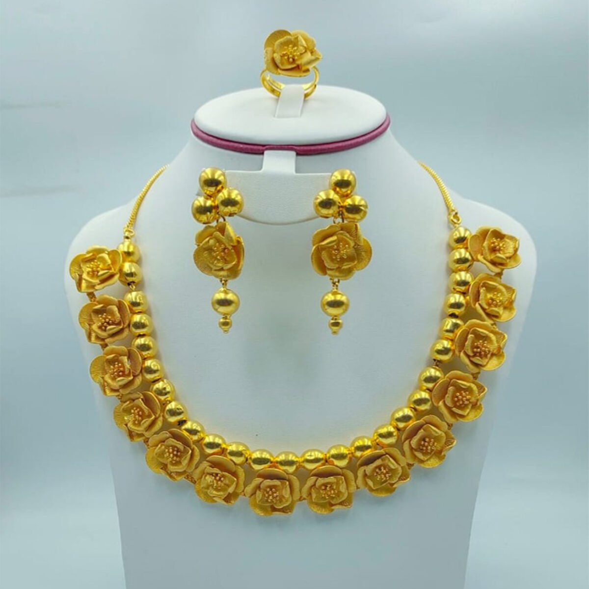 Elevate your elegance with our exclusive royal rose flower necklace and matching hoops. This shimmering choker set is crafted from high-quality materials that are gentle on the skin, ensuring you look fabulous on all occasions. Perfect for weddings, parties, and special events, this sophisticated gold-plated choker set adds a touch of royalty to your look. Highly sought-after in the UAE, including Dubai, Abu Dhabi, and Sharjah, this set is a must-have for any fashion-forward woman.