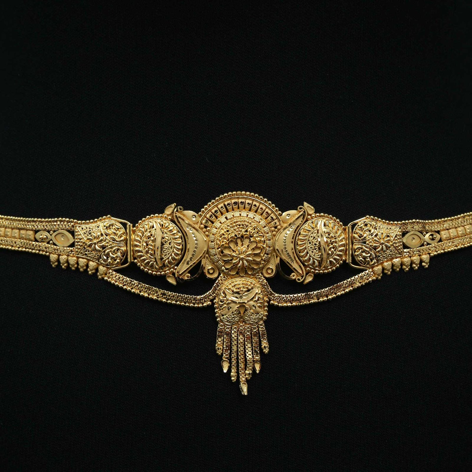 The Minakari golden Mekhala draws inspiration from traditional cultures. The features involved the motifs of divinity crusted with elegant textures and designs to make you feel luxurious. This statement Mekhala belt will be a beauty stealer. Style this sophisticated hip wear with your favorite lehenga or other traditional attire.Β